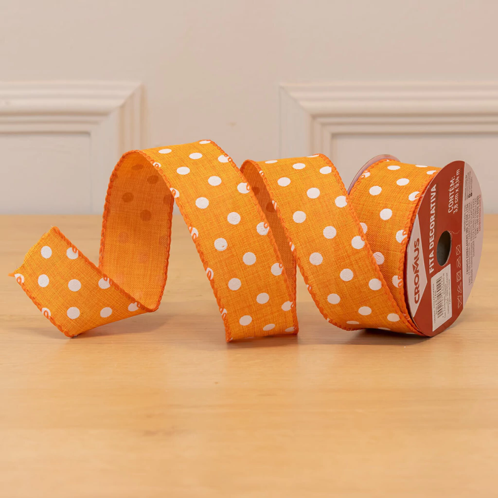 A Fita Aramada Poá Laranja e Branco 3,8cm x 9,14m é ideal para dar um toque vibrante e charmoso às decorações. Seu fundo laranja com estampa de poás brancos traz um visual alegre e sofisticado, perfeito para laços bem estruturados, artesanato, decoração de festas e embalagens de presentes. O arame nas bordas permite fácil modelagem e fixação.